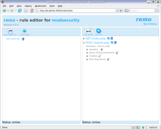 이런 룰 설정을 웹페이지를 통해서 할 수 있는 REMO(Rule Editor for ModSecurity) beta버전을 6월에 발표했고, Howtoforge에 Introducing Remo - An Easy Way to Secure an Insecure Online Application with ModSecurity 제목으로 REMO 다루는 방법에 대한 글이 올라왔다. 자세한 글은 Howtoforge에 글을 보시고, 간단하게 설명하면 이렇다.