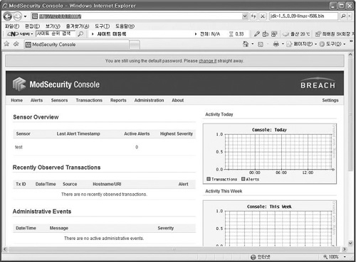 이제 modsecurity-console을 실행하면 잠시 후 8886/tcp에서 포트를 리슨하고 이 포트로 접속하면 된다. 초기 기본 ID와 암호인 admin/admin으로 로그인하면 (화면 1)과 같은 화면을 볼 수 있다.